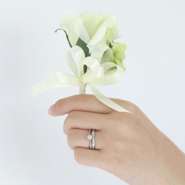 優しさと洗練さの2つの表情が楽しめるセットリングは、美指効果を高める深めのVラインと贅沢なダイヤをあしらい、花嫁の薬指で美しく咲き誇る。